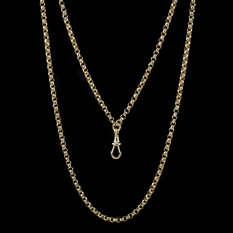 A grand antique Victorian guard chain from the late 19th Century consisting of faceted 9ct gold cable links leading to a claw clasp at the end which would have traditionally been adorned with a pocket watch or lorgnette.